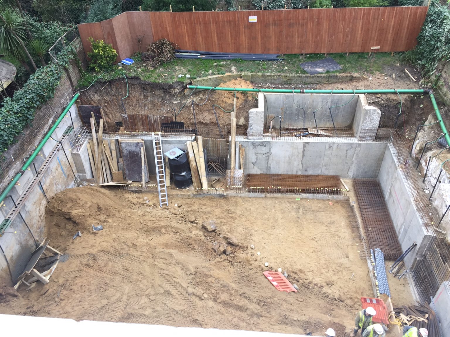 A full-depth basement formed beneath an occupied Victorian terrace and rear garden at Holland Villas Road, west London. Works included temporary steel propping to support the ground floor during excavation, sequential perimeter retaining wall construction, underpinning of the existing structure, and a reinforced concrete floor slab – all completed while maintaining the integrity of the neighbouring properties